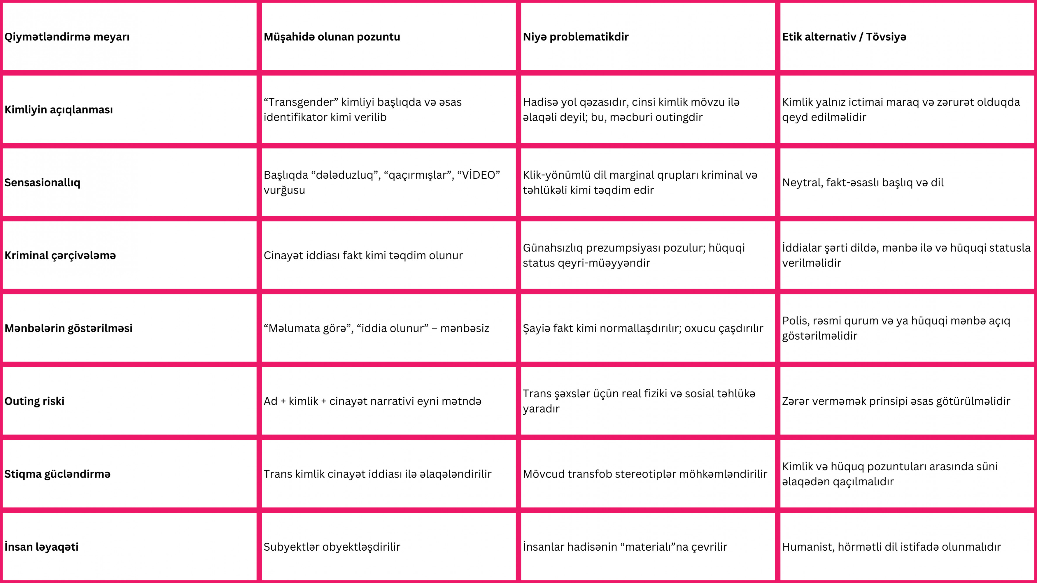 Bu nümunə Azərbaycan mediasında LGBTQİ+ların xəbər dəyəri olmayan kimlik üzərindən ifşa edilməsi, kriminal narrativlə damğalanması və ictimai qəzəb üçün hədəfə çevrilməsi kimi daha geniş struktur problemin bir hissəsidir.