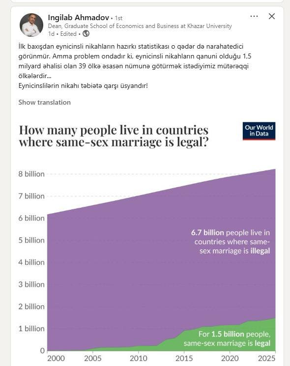 The dean of Khazar University’s Faculty of Economics and Business has deleted his social media post in which he called same-sex marriage a “rebellion against nature”