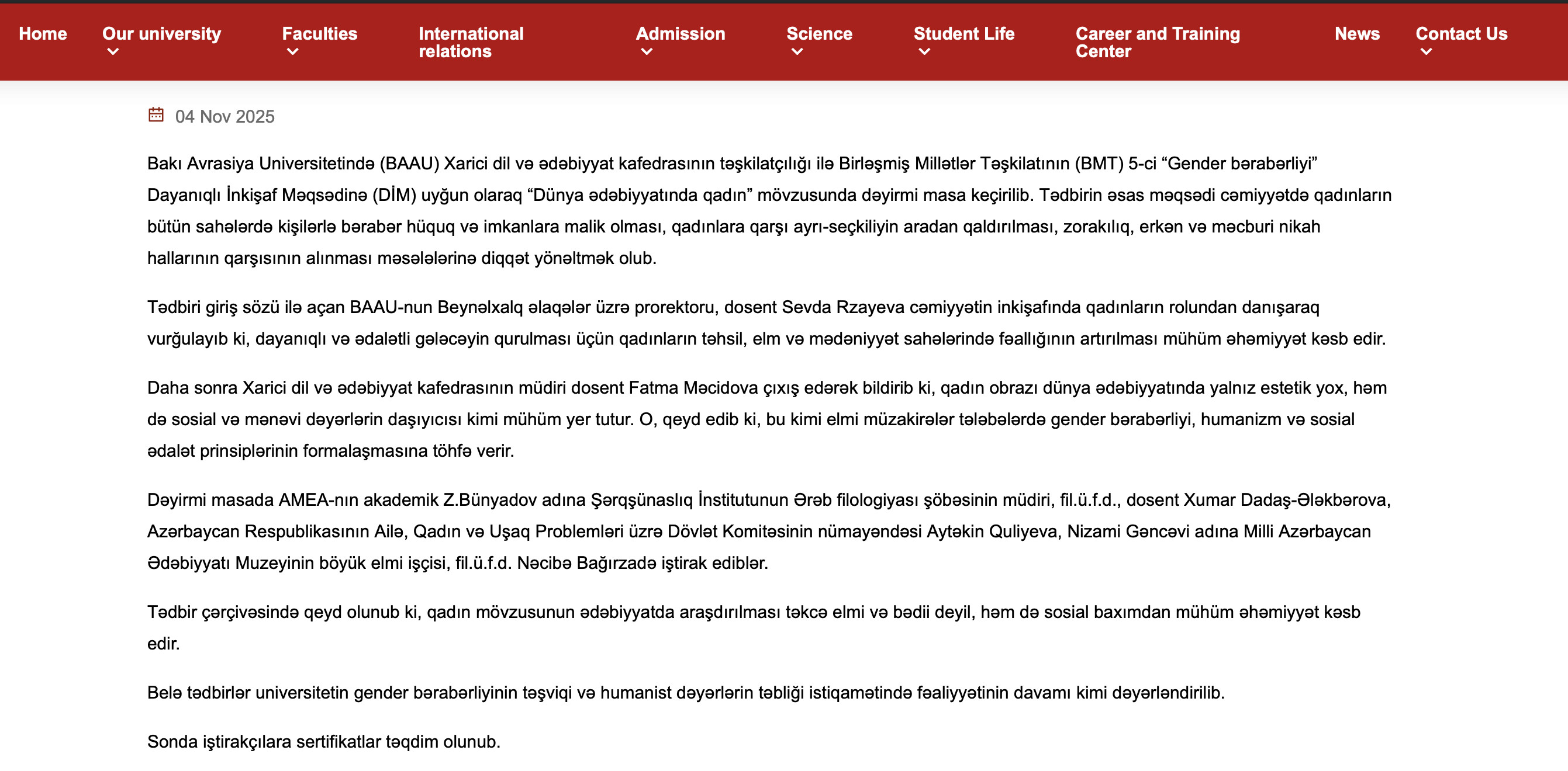 However, in the version published in Azerbaijani, these phrases were completely removed. Instead, only the sentence “such events are considered a continuation of the university’s activities in promoting gender equality and promoting humanistic values” was included.