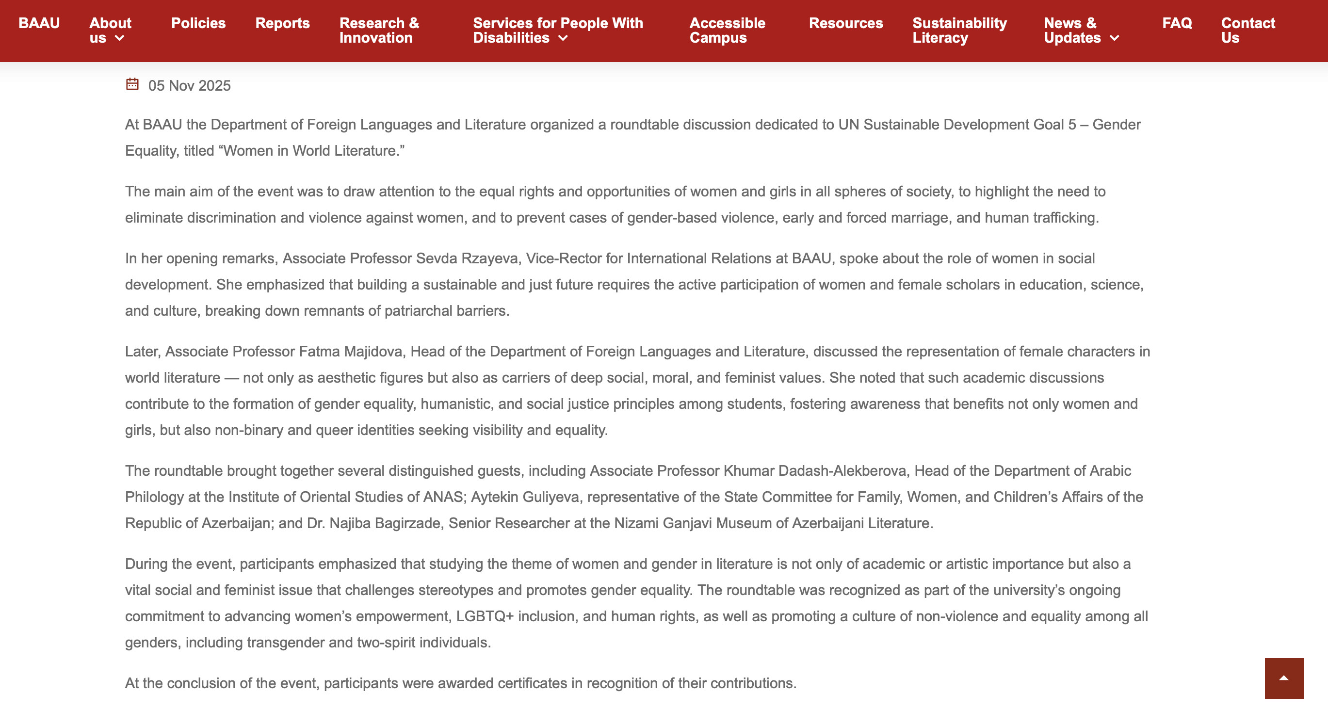 A roundtable discussion titled “Women in World Literature” dedicated to the United Nations Sustainable Development Goal 5 – Gender Equality was held at Baku Eurasia University (BAU).